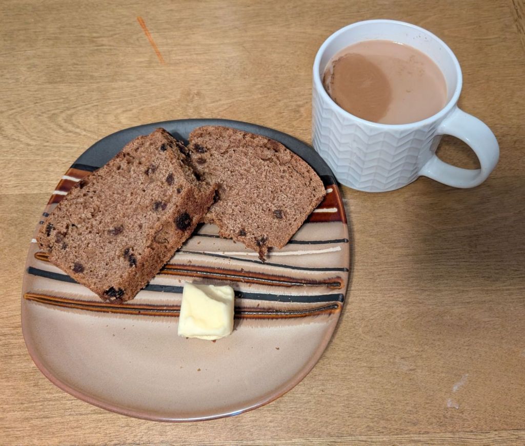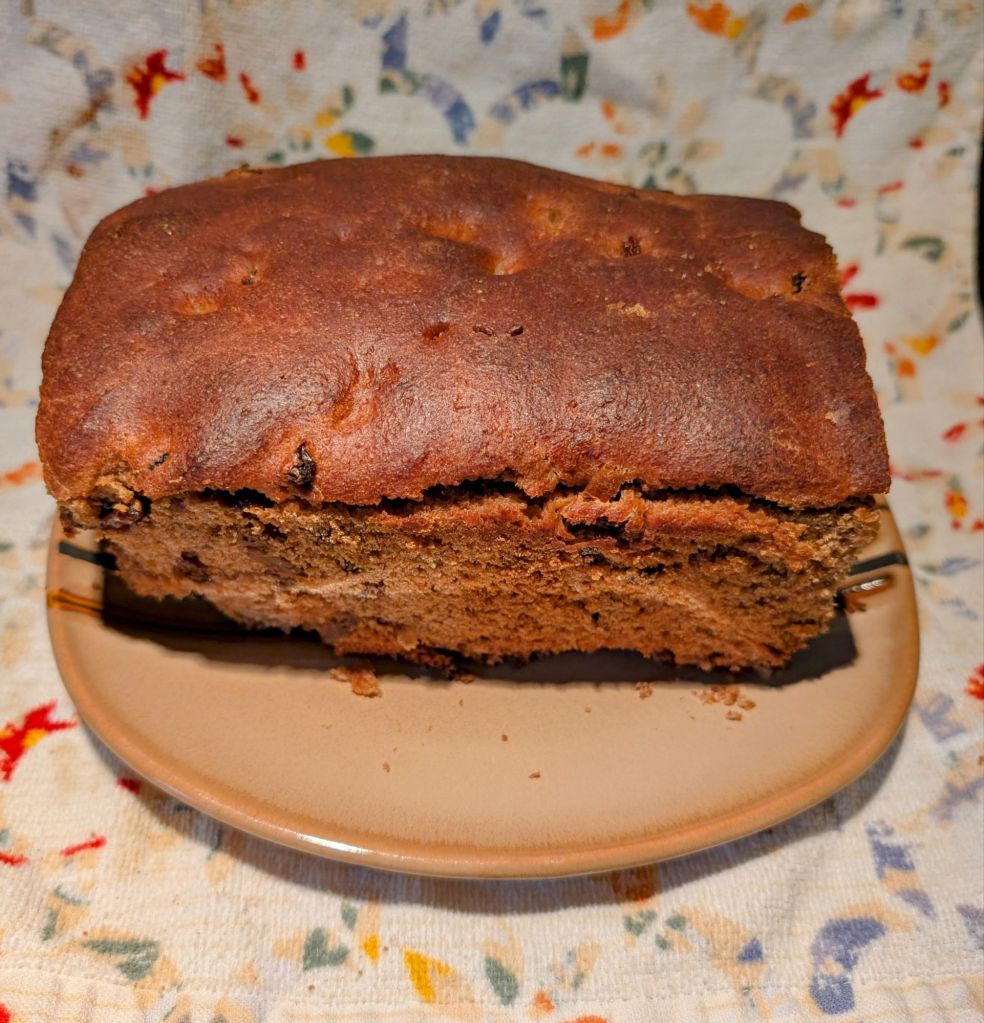 I starter a new sourdough starter and when It was time to discard some decided to try and make a sourdough discard whole wheat raisin bread. I used the same base recipe as before but since I had over a cup and half of discard I just added less flour and water to make up the difference. Since my starter is still a baby and not strong enough to raise the bread on its own I kept the yeast in the recipe. Now I know better than to start bread in the middle of the day. Starting bread later in the day means staying up late until it’s done baking. Baking something was on my to-do list for the day and I missed having raisin bread in the house. what this led to however was the bread needed to go in the oven during my toddler’s bedtime. I asked my husband to put the bread in oven on 350 for 35 minutes while I got the her to sleep. When I came downstairs and pulled it out of the oven my bread was dark , not burnt dark but definitely a few steps above sun kissed. I looked at the oven and saw my husband had put the bread on 360 instead of 350. Even though it was a little dark it was still really good!