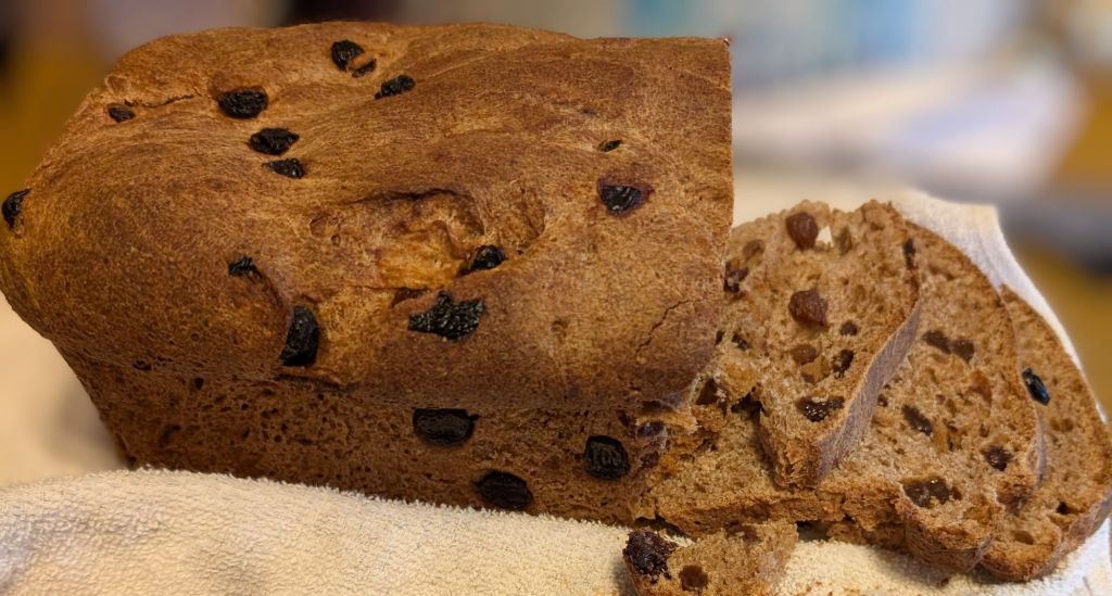 Raisin bread is now becoming a staple in my house. I plan to make it once a month. Now I am still working on my recipe for raisin bread but if you want to try your hand at it its fairly simple. Use the link above and use that recipe. When it comes to adding the butter and honey also add a cup of raisins, 2 teaspoons of cinnamon and a half a cup of sugar. Do that and you will make some simple and yummy raisin bread. If you want to make sourdough raisin bread substitute the yeast for a half a cup to a cup sourdough starter. Good luck on your raisin breads, if you decide to try it out! I’m about to go cut two slices of raisin bread and toast it with some butter and pour me a cup of coffee.