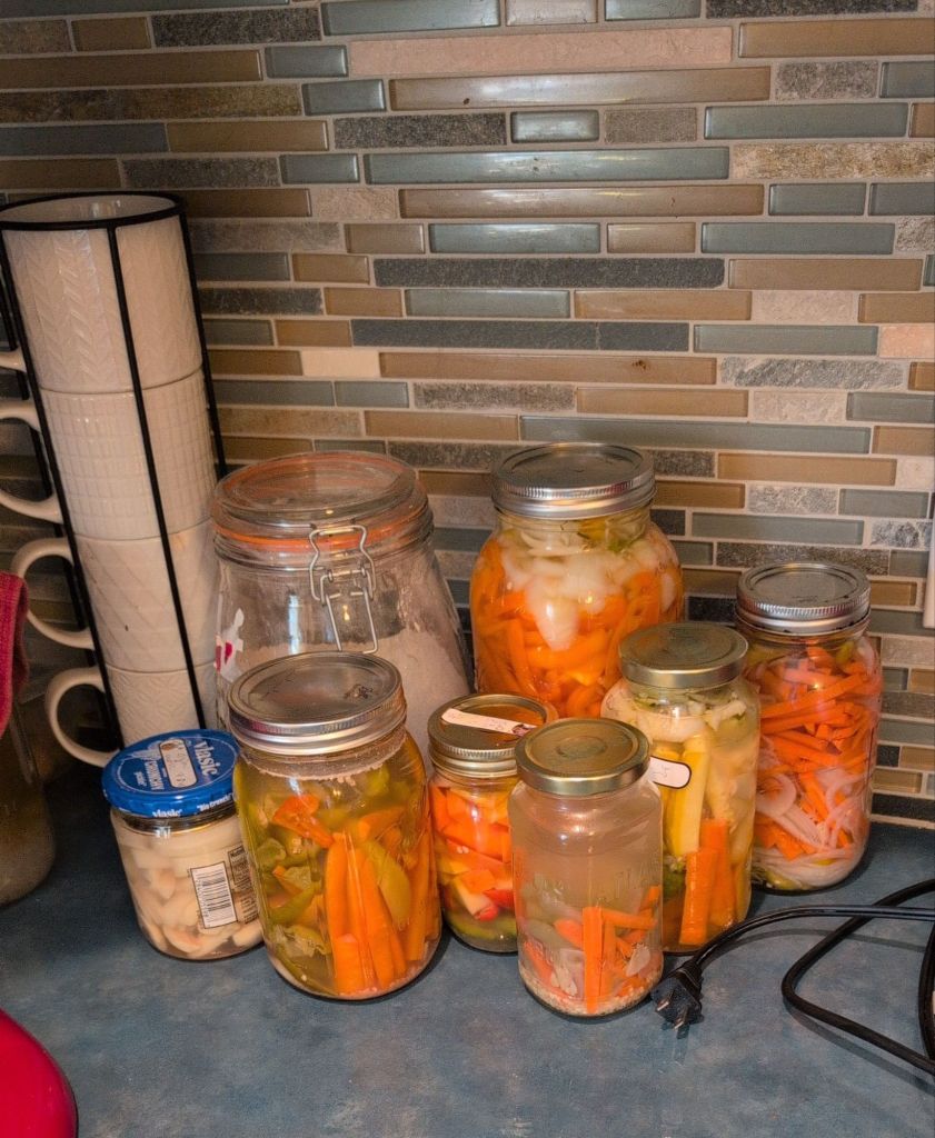My husband likes to make this mixture in which he essentially pickles peppers with onions and carrots. I did a similar process but instead of using vinegar I used a salt water brine to induce fermentation. I also use Cabbage, okra, eggplant and summer squash. My goal is to make a mixed vegetable ferment. I’ve also heard good things about fermented garlic and have a jar of that on my counter as well in an old salsa jar. I hope to ferment the last bits of my fall harvest in hopes to reduce my grocery bill during the winter months.